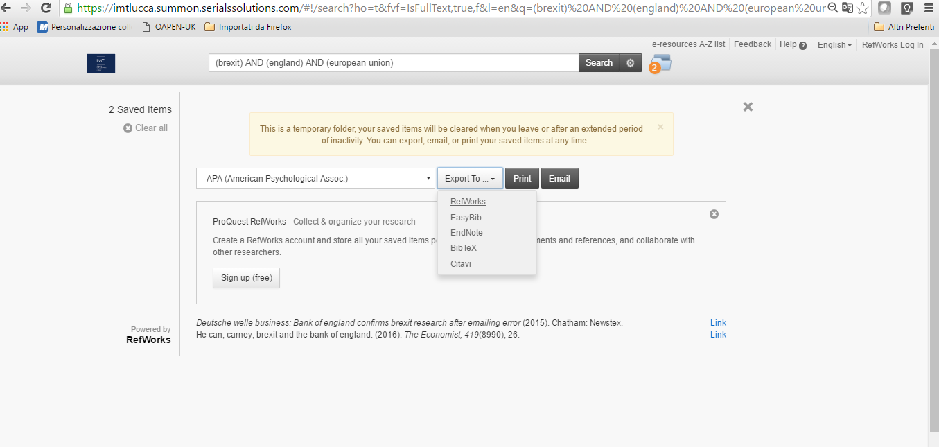 When you search for articles in Summon, you have the possibility to save items in a temporary folder that will be cleared when you leave or after an extended period of inactivity. But if you need to save your searches for more time, for example to read them later or to use the reference in your research papers, you can export them in RefWorks.